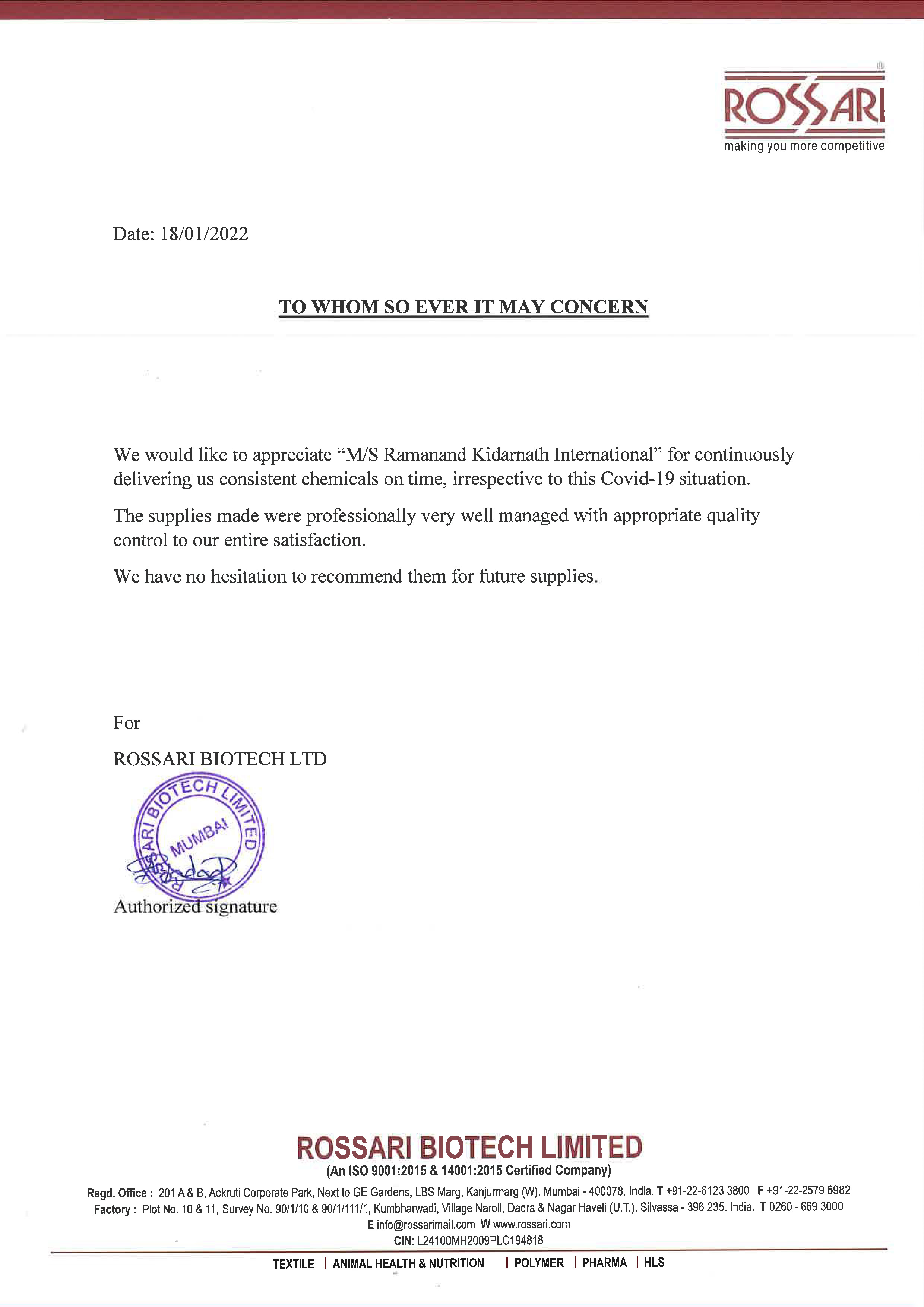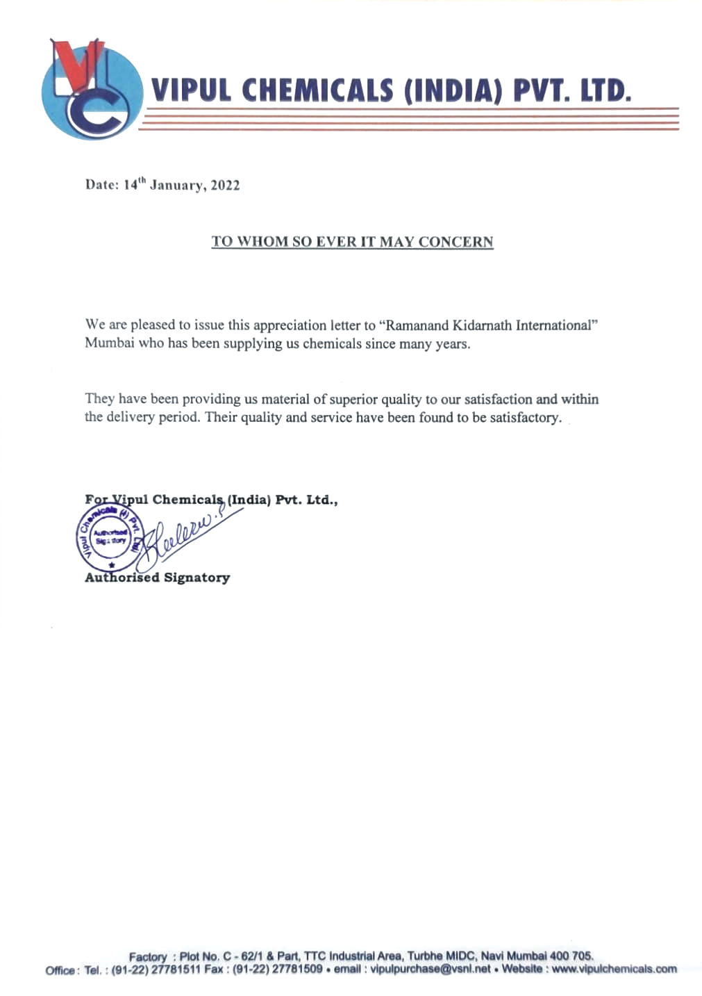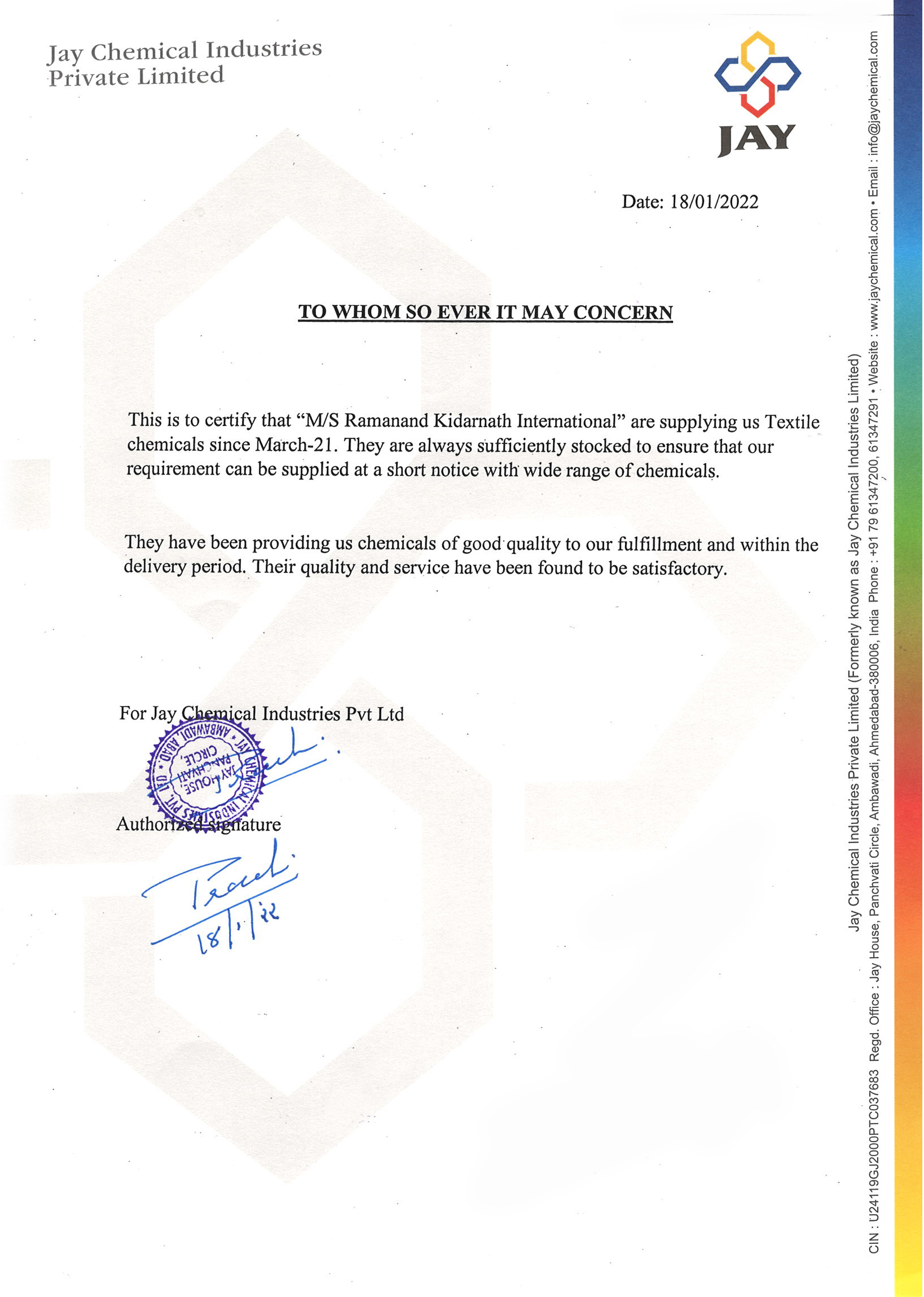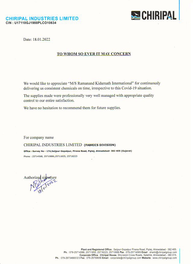 Ramanand Kidarnath International is a leading specialty chemicals company offering a wide product range of top-notch quality dyes and chemicals from renowned market leaders such as BASF, DyStar and Archroma. We have a time-honored history in trading since 1815 and more specifically a legacy in dyes and specialty chemicals since 1965. We aspire to attain economic success while marketing our innovative products and leveraging our long-lasting relationships with both, our customers and principals.