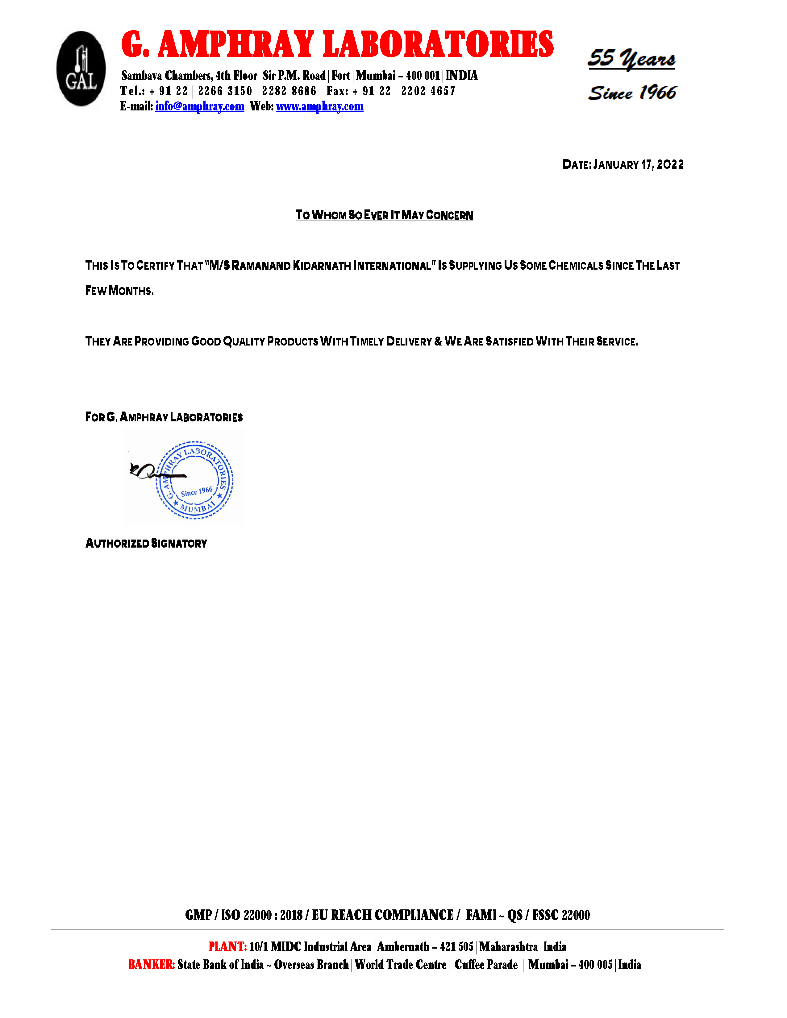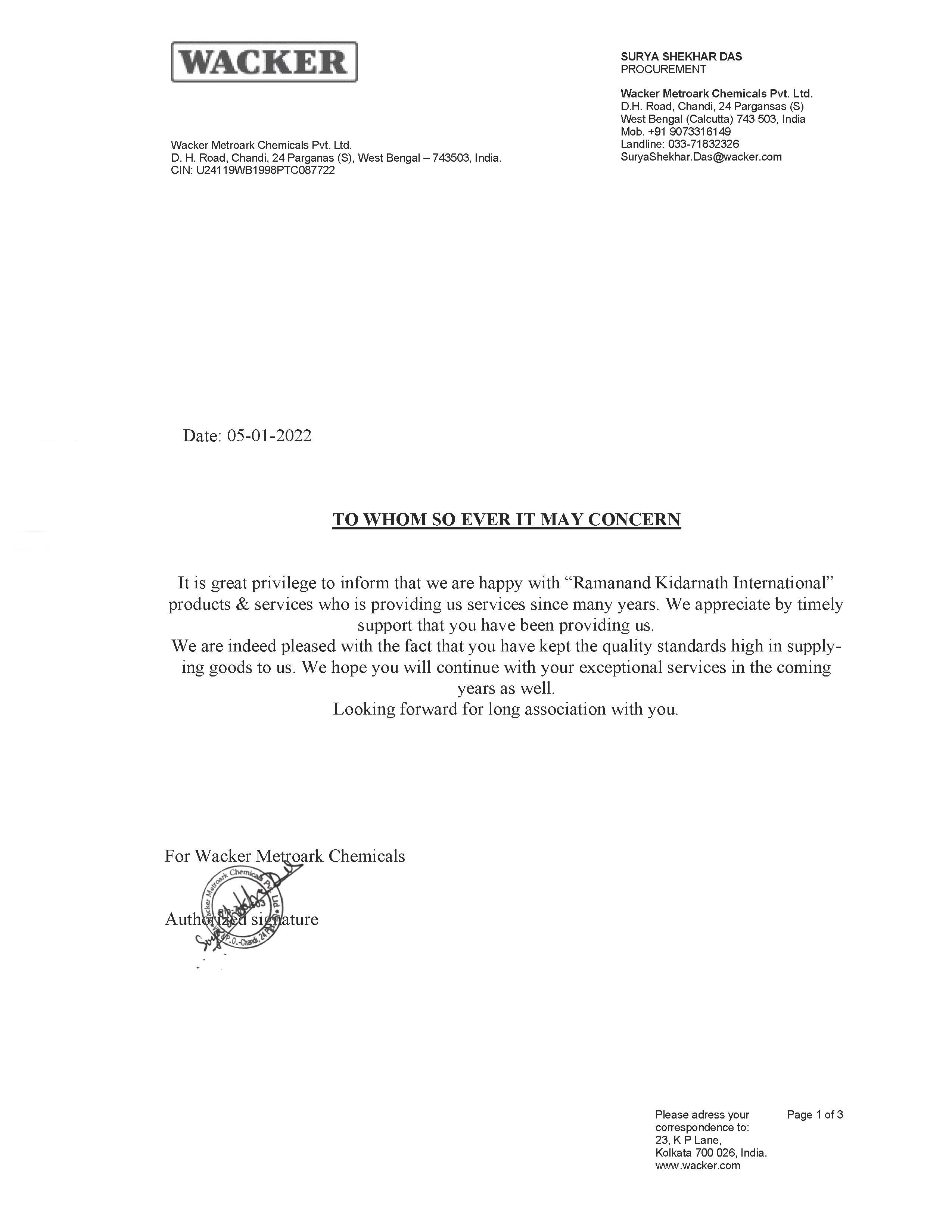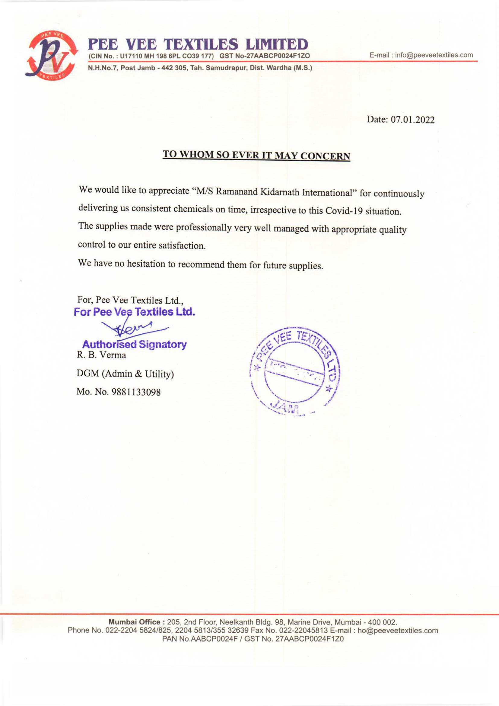 Ramanand Kidarnath International is a leading specialty chemicals company offering a wide product range of top-notch quality dyes and chemicals from renowned market leaders such as BASF, DyStar and Archroma. We have a time-honored history in trading since 1815 and more specifically a legacy in dyes and specialty chemicals since 1965. We aspire to attain economic success while marketing our innovative products and leveraging our long-lasting relationships with both, our customers and principals.